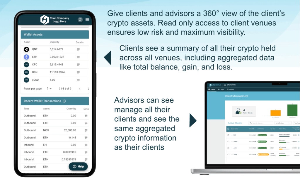ATLANTA, GA – September 25th, 2025 – Ledgible, the leading digital asset tax and accounting platform, today announced the expansion of its Digital Asset Portfolio and Advisor solution, delivering financial institutions and advisors a comprehensive, white-label, API-driven platform to surface and manage digital asset data. With these enhancements, the solution now provides a truly holistic way for traditional financial services to integrate crypto asset visibility alongside existing client portfolios.